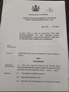 The Taraba State House of Assembly has passed the Taraba State Environmental Sanitation Agency (Establishment) Bill, 2025, following the adoption of the report of the House Committee on Environment, Urban and Forestry Potentials.
